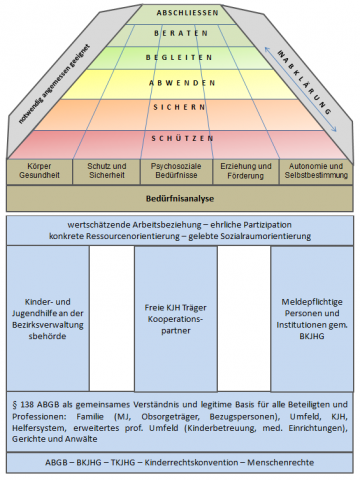 Das Fundament der Gesamtkonzeption ist die Österreichische Gesetzeslage in Kombination mit der Kinderrechtskonvention und den Menschenrechten. Im Speziellen bietet der § 138 ABGB ein gemeinsames Grundverständnis vom abstrakten Begriff Kindeswohl und soll die Basis für alle Beteiligten und Professionen bieten. Die Familie ist eine durch viele Rechte und Bestimmungen abgesicherte Einheit, in deren Autonomie nur unter bestimmten Voraussetzungen vom Staat, durch Behörden und Gerichte, eingegriffen werden darf.